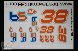 The sticker sheets are A5 in size printed in 6 colours, with a petrol resistant varnish and kiss-cut into individual stickers. Featuring Bradley's Logo/Number and Website at various sizes that could be used for many different applications.